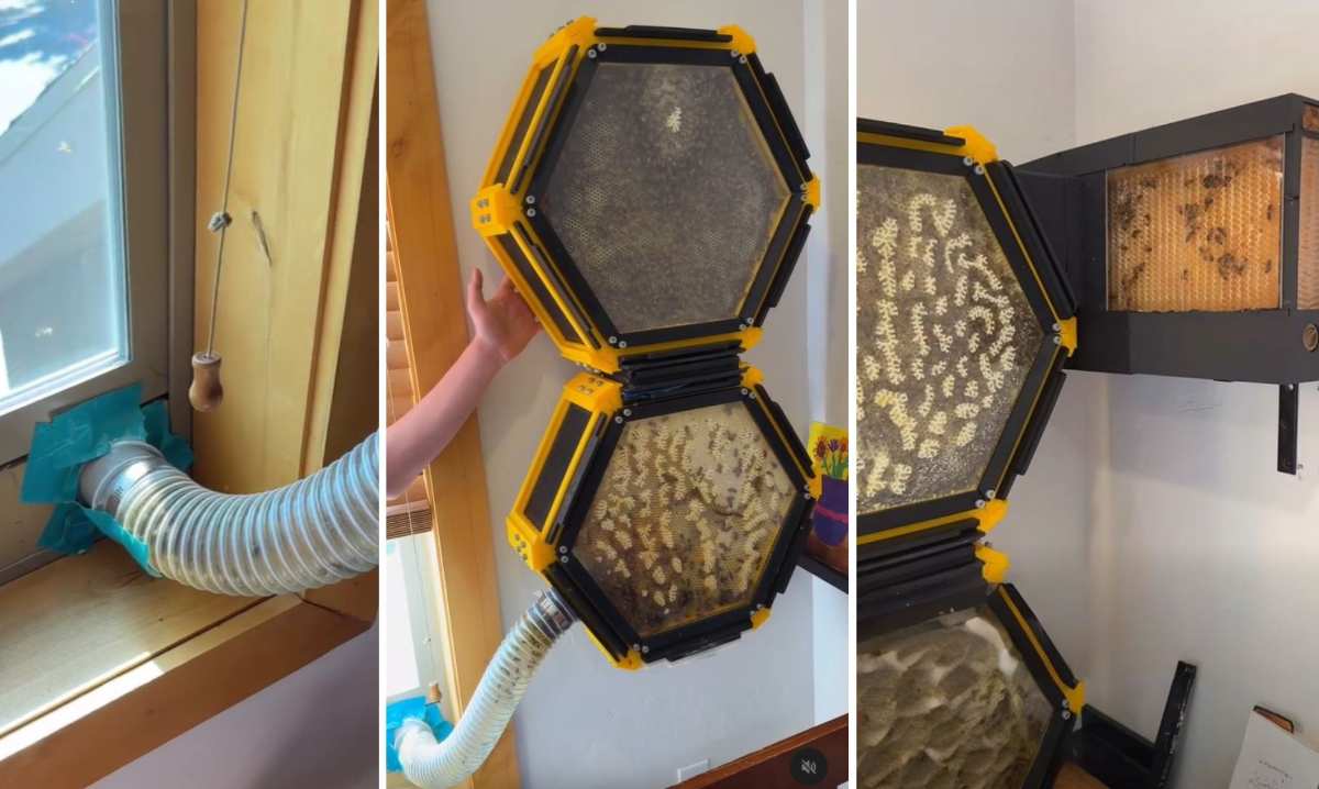Utilizza un sistema modulare esagonale progettato in software CAD, collegato a una finestra per consentire alle api di entrare e
