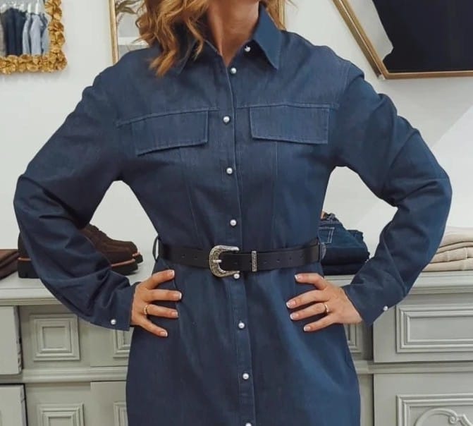 Immagina di indossare un vestito che unisce il comfort del denim alla raffinatezza delle chiusure a effetto perla: ogni dettaglio è pensato per farti brillare. Ma non finisce qui! La cintura dal gusto country aggiunge quel tocco sportivo che rende questo abitino perfetto per un brunch con le amiche o una passeggiata nel parco.