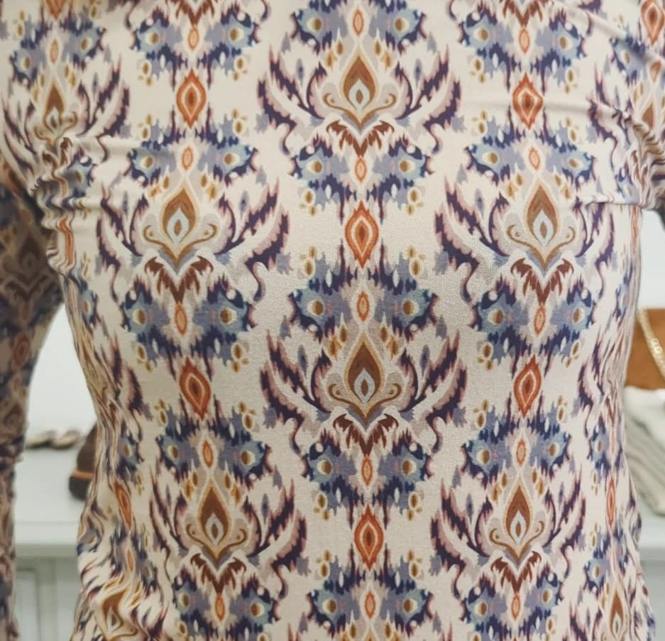 Con il suo colletto alla coreana, è perfetta per chi ama un tocco di eleganza senza rinunciare al comfort. Ma non è tutto: la stampa entnica è un vero capolavoro! Sembra un dipinto orientaleggiante, con colori caldi che richiamano le sfumature dell’autunno, rendendola abbinabile a qualsiasi outfit.