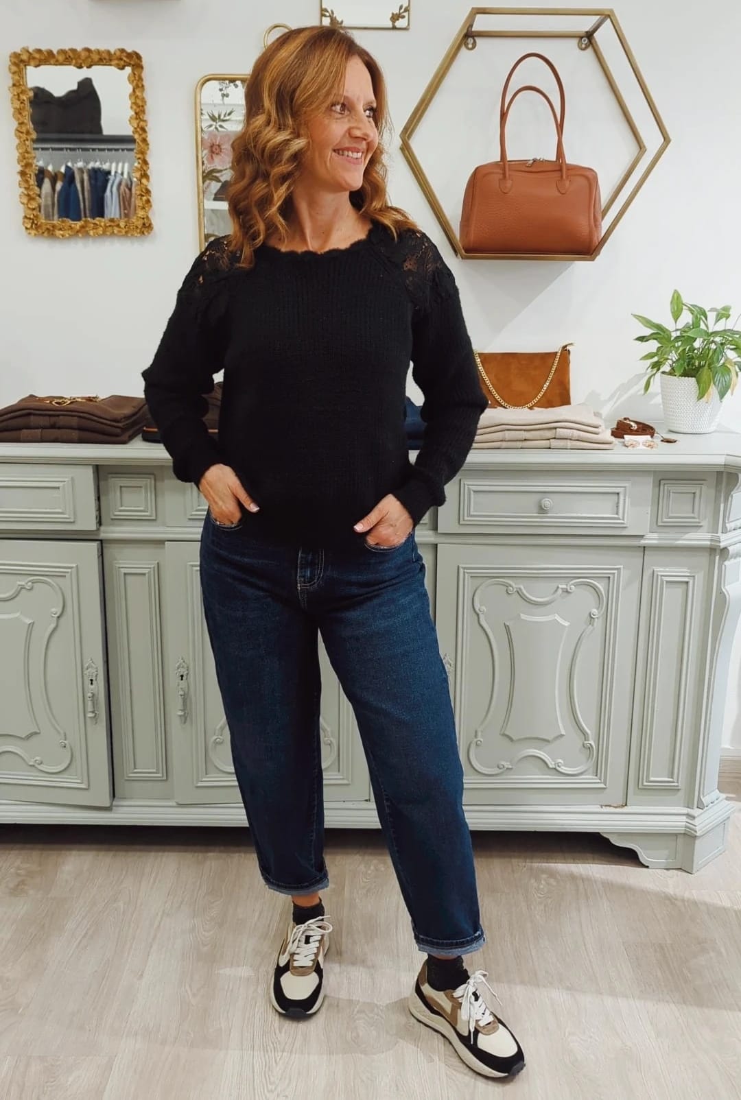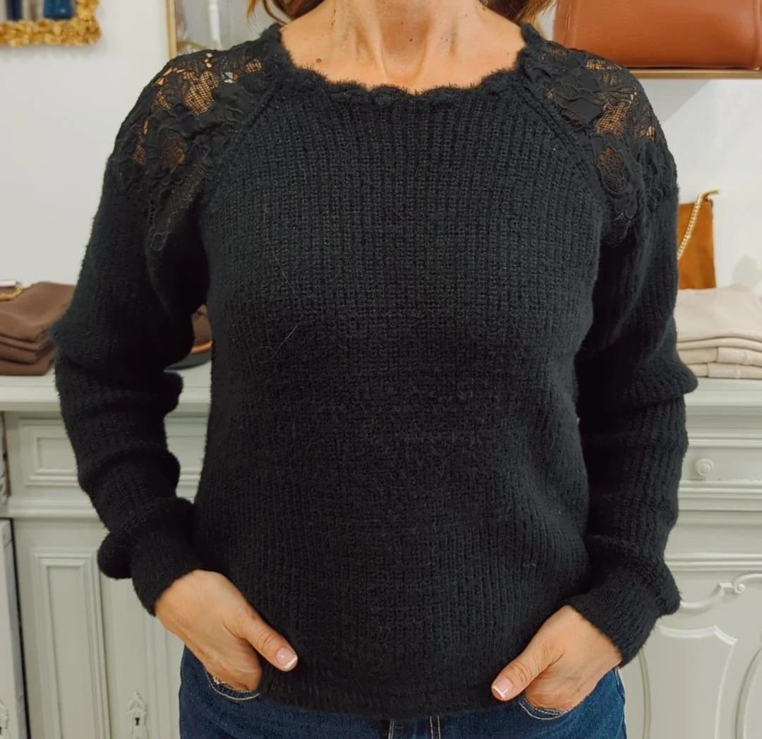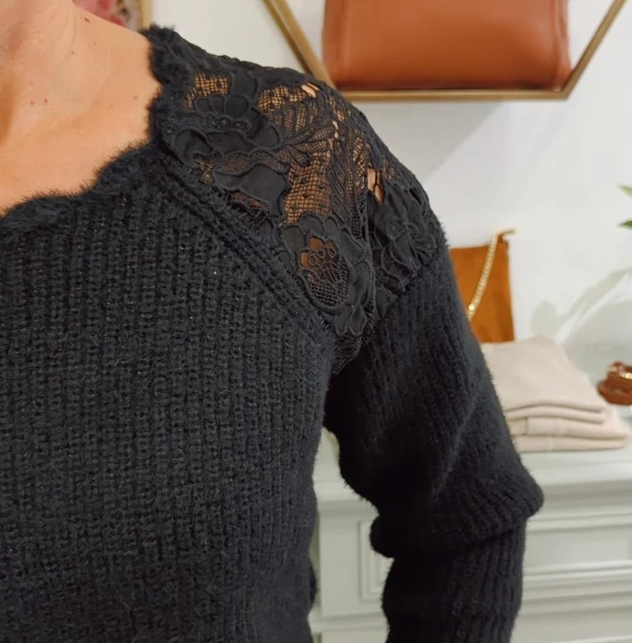 Realizzato in un morbido tessuto che avvolge la pelle come un abbraccio caldo, questo maglione è impreziosito da un leggero filo in lurex che dona un tocco di lucentezza e raffinatezza. Ma non è tutto: le spalle sono adornate da un bellissimo pizzo nero, un dettaglio che aggiunge un pizzico di eleganza e femminilità al tuo look.
