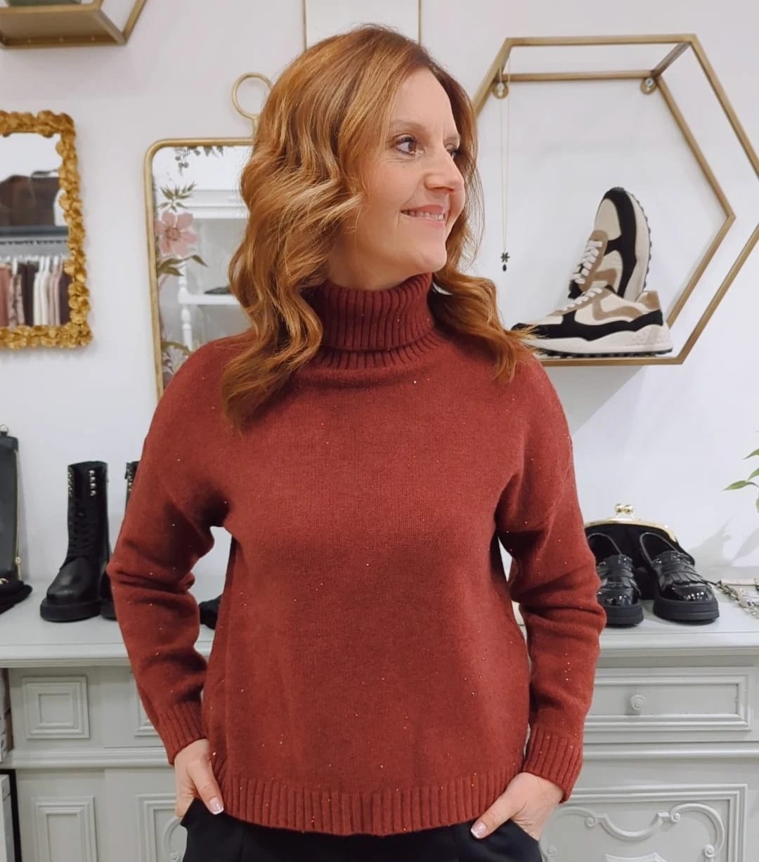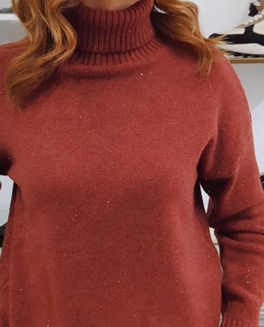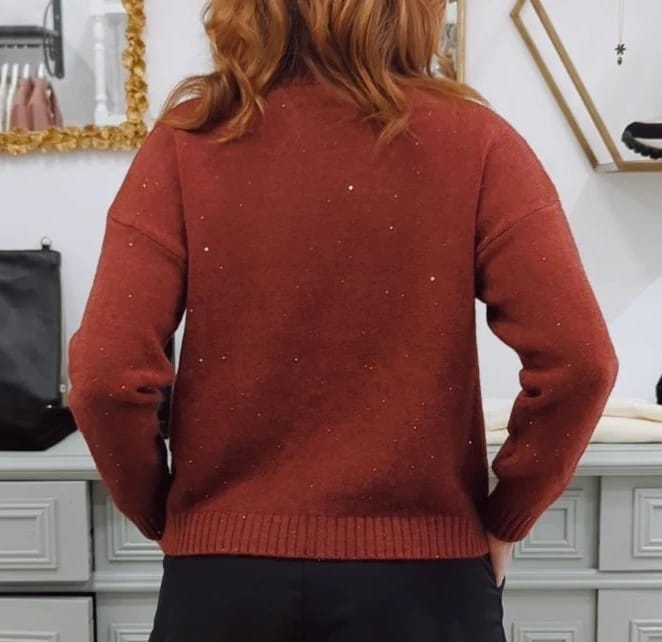 La sua particolarità? Piccole paillettes che scintillano delicatamente alla luce, rendendo il maglione luminoso e accattivante. Immagina di indossarlo durante una passeggiata invernale, con la neve che cade dolcemente e tu che brilli come una stella!